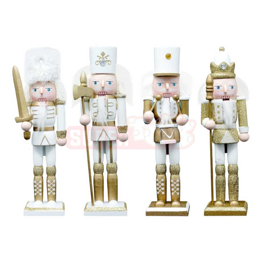 Ağ və qızılı tonlarda hazırlanmış 4 ədəd Şelkunçik (Nutcracker/Fındıqqıran) fiqur dəsti Yeni il dekorasiyası üçün zərif və harmonik görünüş yaradır. Hər fiqur fərqli dizayn və aksesuarla bəzədilib – qılınc, nizə, topuz və kral çubuğu kimi detallarla kolleksiya tam bayram simvoluna çevrilib. Kiçik ölçülü olduqları üçün masa üstü, rəf, pəncərə kənarı və ya yolka altı dekorasiyalarda mükəmməl görünür. Parlaq qızılı bəzəkləri və əl işi incəliyi ilə istənilən interyerə bayram parıltısı əlavə edir.