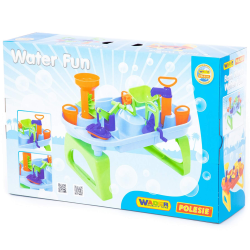 Water Fun su oyun masası – uşaqlar üçün həm əyləncəli, həm də öyrədici su oyun sahəsidir. Rəngarəng dizayna malik bu stol tipli masa müxtəlif kranlar, su axını mexanizmləri və fırlanan elementlərlə təchiz edilib. Uşaqlar suyu bir nöqtədən digərinə axıdaraq həm müşahidə, həm də motor bacarıqlarını inkişaf etdirə bilər. Evdə və açıq havada istifadə üçün uyğundur – xüsusilə isti yay günlərində ideal əyləncə vasitəsidir.