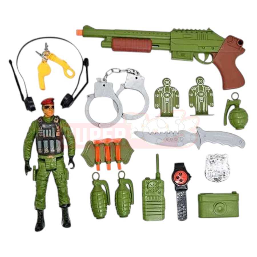 Bu geniş komplektli Əsgər Dəsti Oyuncaq hərbi temalı oyunları sevən uşaqlar üçün ideal seçimdir. Dəstdə əsgər fiquru, oyuncaq silahlar, walkie-talkie, əl bombaları, papaq, hərbi nişan, bıçaq, qandal, hədəf lövhələri və digər aksesuarlar yer alır. Bu zəngin set uşağın yaradıcı oyununu genişləndirir, rollu oyun bacarıqlarını və təsəvvürünü inkişaf etdirir. Güvənli plastik materialdan hazırlanmışdır və ev içi oyunlar üçün tam uyğundur.