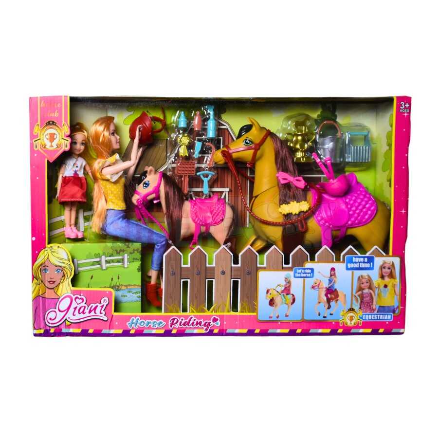 Kukla Giana Horse Riding dəsti at minmə mövzusunda hazırlanmış geniş və əyləncəli oyun dəstidir. Dəstdə Giana kuklası, kiçik kukla, iki böyük at fiquru, çəpər, yəhər, qayış və ferma temalı aksesuarlar yer alır. Uşaqlar kuklanı atın üstünə mindirib macəra dolu oyun ssenariləri yarada bilər. Ferma həyatı, heyvan baxımı və binicilik mövzularını əyləncəli şəkildə təqdim edən bu dəst yaradıcılığı və rol oyunu bacarıqlarını inkişaf etdirir.