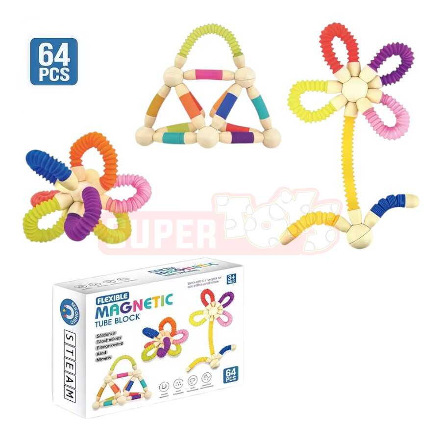 64 parçalı Elastik Maqnitli Qurma Oyunu uşaqlar üçün həm əyləncəli, həm də öyrədici bir inkişaf vasitəsidir. Bu STEAM prinsiplərinə əsaslanan oyuncaq sayəsində uşaqlar çevik və maqnitli borulardan müxtəlif fiqurlar, çiçəklər, strukturlar və yaradıcı formalar qura bilirlər.