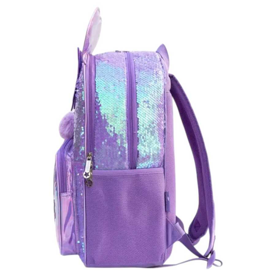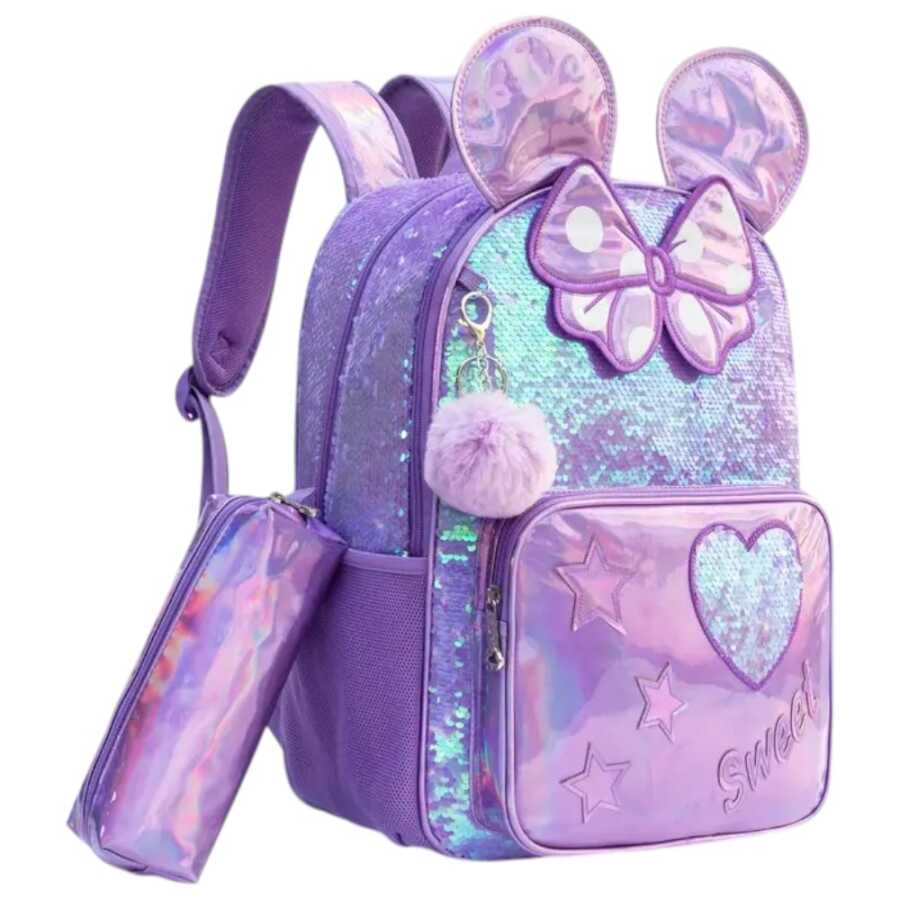 Xüsusi dizaynlı bu məktəb çantası seti hər bir qız uşağı üçün arzulanan dəstdir. Bənövşəyi və parıltılı rəng tonları, ön hissəsində ürək və ulduz naxışları, üstündə isə şirin qulaq və lent aksesuarı ilə diqqət çəkir. Setin içində məktəb çantası, uyğun dizaynlı yemək qabı və qələm qabı mövcuddur. Bu dəst həm məktəbə hazırlığı zövqlü edir, həm də uşağın əşyalarını təşkilli və təhlükəsiz saxlamağa imkan yaradır. Bu məhsulu Supertoys mağazalarından və onlayn satışdan əldə edə bilərsiniz.