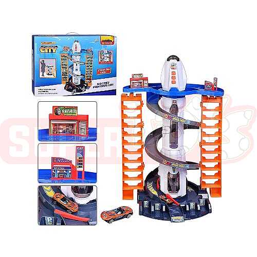 Dəstdə rampalı yol, parkinq yerləri və oyuncaq maşınlar üçün giriş-çıxış hissələri mövcuddur. Uşaqlar maşınları mərtəbələr arasında hərəkət etdirərək öz şəhər və qaraj oyunlarını qura bilərlər.