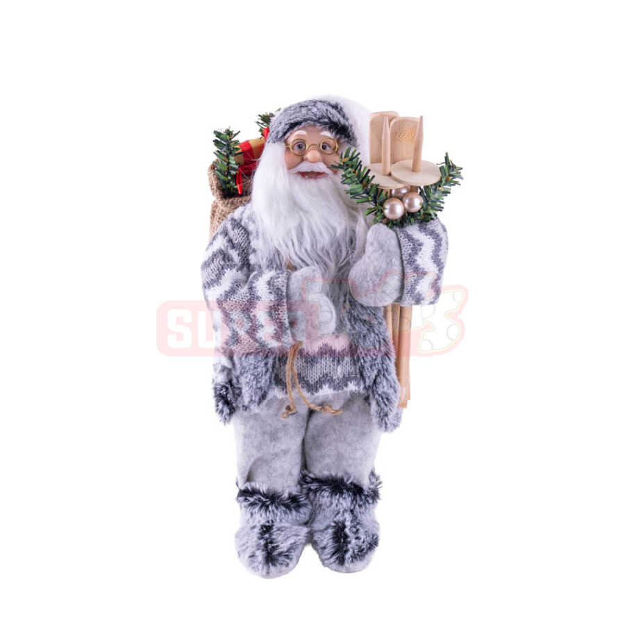 Bu boz geyimli Şaxta Baba fiquru qış mövsümünün təmiz və sakit atmosferini evinizə gətirir. Yumşaq toxumalı geyimi, toxunma naxışlı sviteri və tüklü çəkmələri ilə bu fiqur həm isti, həm də təbii görünüş yaradır. Əlindəki şam budağı və skilər Yeni il mövsümünə xas detalları tamamlayır. Çiynindəki hədiyyə dolu kisəsi isə bolluq və paylaşım rəmzidir. Həm klassik, həm də skandinav tərzli interyerlərdə bu fiqur bayram dekorasiyasına xüsusi ahəng qatır.