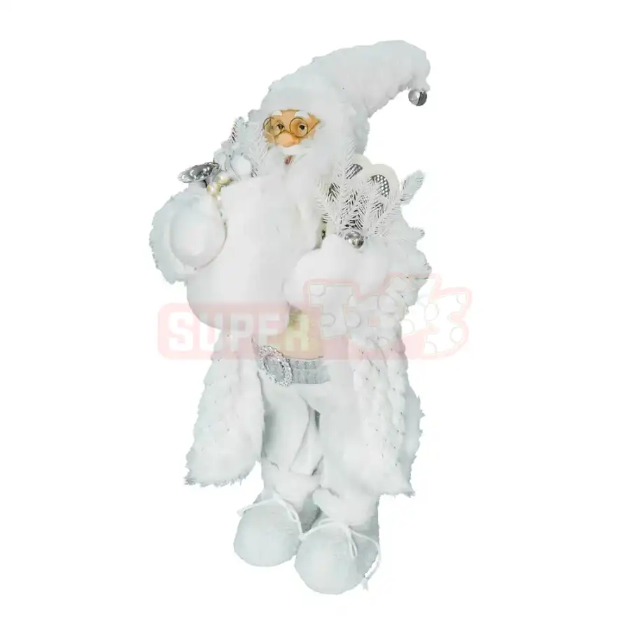 Ağ rəngli klassik Şaxta Baba fiquru Yeni il dekorasiyasında həm zərif, həm də çox möhtəşəm görüntü yaradır. Yumşaq toxumalı geyim, detallı aksesuarlar, kürəkdəki dekorativ ağ dəst və təbii görünüşlü saqqal fiqura premium görüntü bəxş edir. Ev dekoru, mağaza vitrini, tədbir sahəsi və fotostudiya üçün ideal seçimdir.