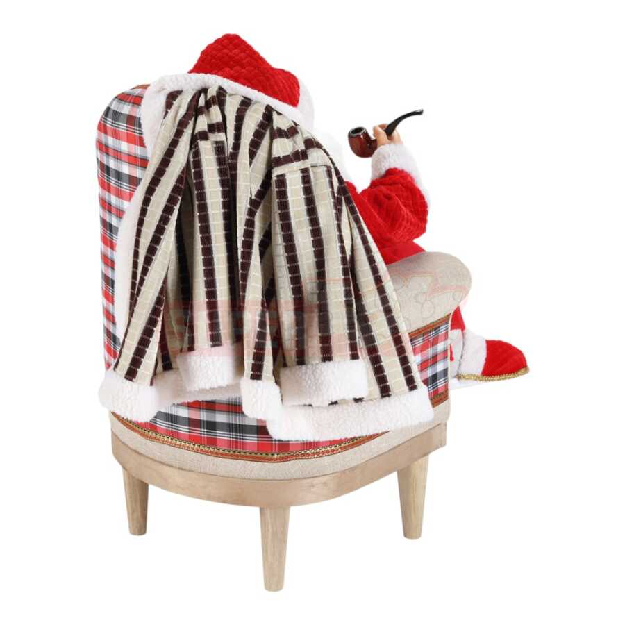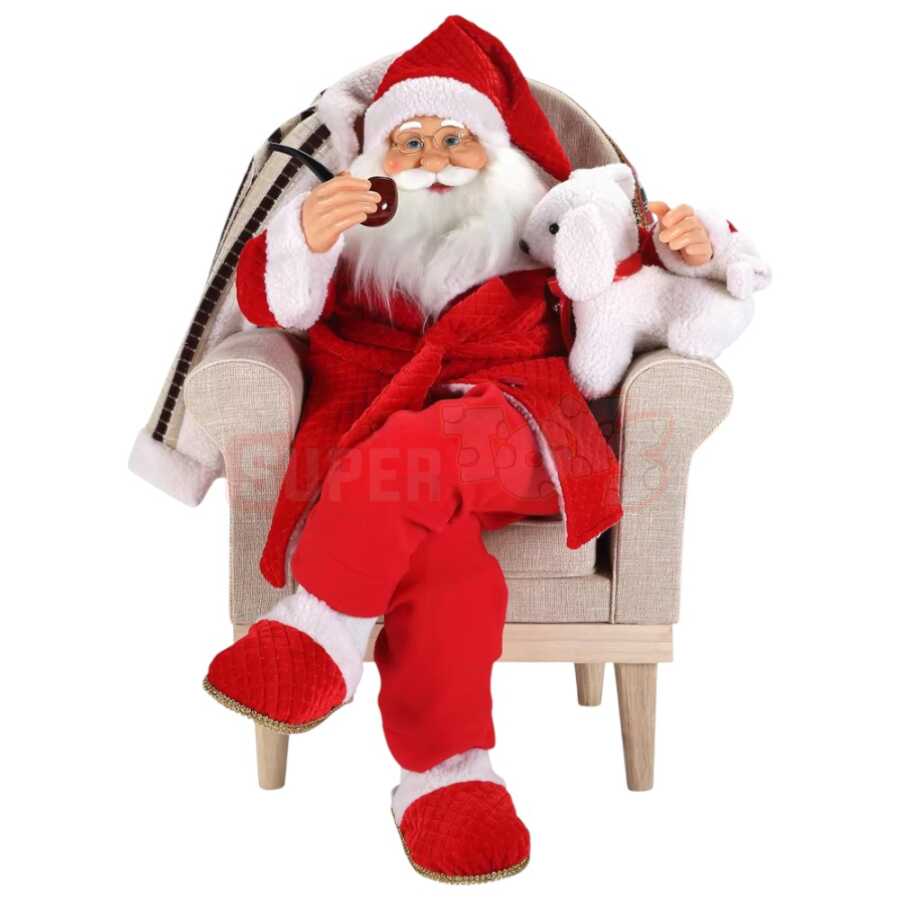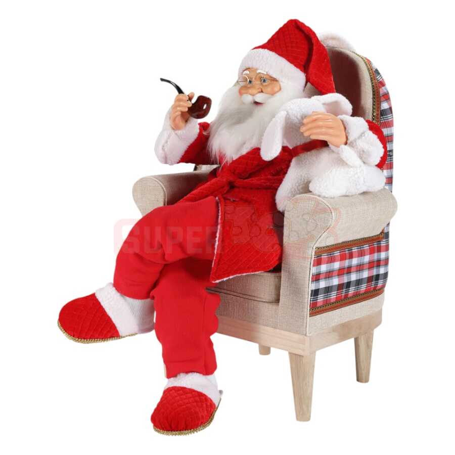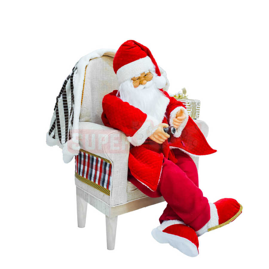 Böyük ölçülü hərəkətli Yeni İl Santa fiquru bayram dekorasiyanız üçün ideal seçimdir! Oturacaqda əyləşmiş bu dekorativ Santa başını tərpədir, əlini ağzına apararaq uşaqlar üçün əyləncəli bir görüntü yaradır. Əynində klassik qırmızı paltarı, yumşaq ev geyimi və əlində oyuncaq köpəklə tam Yeni İl ab-havası bəxş edir. Evinizdə, ofisdə və ya mağaza dekorasiyasında gözoxşayan bayram atmosferi yaratmaq üçün mükəmməl aksessuardır. Həm uşaqlar, həm də böyüklər üçün əyləncəli vizual hədiyyəlik dekor seçimidir.
