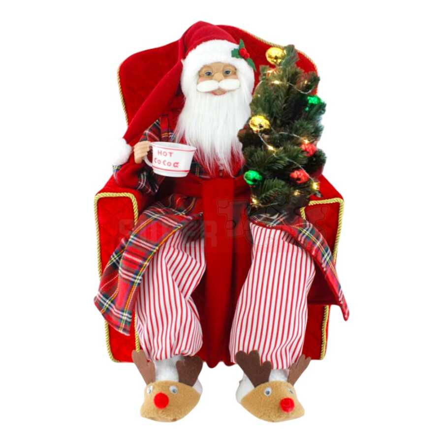 Böyük ölçülü hərəkətli Yeni İl Santa fiquru ilə evinizə bayram sehrini gətirin! Yumşaq kresloda oturan Santa fiquru başını tərpədir, əlini ağzına aparır və əlinə tutduğu fincanla bayram ab-havası yaradır. Yanında işıqlı yolka ilə birlikdə həm uşaqlar, həm də böyüklər üçün əyləncəli görüntü təqdim edir. Klassik qırmızı geyimi, şən geyim detalları və geyindiyi maral naxışlı ev ayaqqabıları ilə dekorasiyanıza xüsusi rəng qatır. Ev, vitrin və ofis dekorasiyası üçün ideal seçimdir, həmçinin hədiyyəlik olaraq da mükəmməldir.