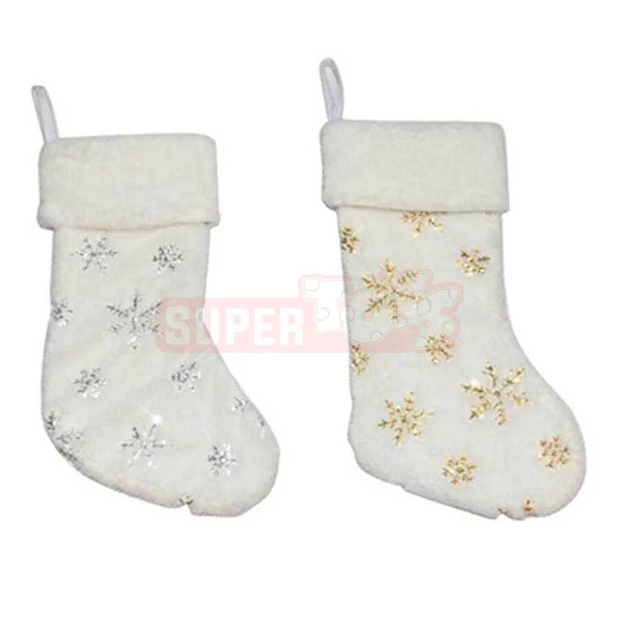 Ağ Şaxta Baba corabı qızılı və gümüşü qar dənəsi naxışları ilə Yeni ilin əvəzolunmaz dekorasiyasıdır. Bu corabları yolkanın üzərinə və ya divara asaraq hədiyyələri bəzəkli formada yerləşdirə bilərsiniz. Yumşaq materialdan hazırlanmış bu corab həm dekorativ, həm də praktiki məqsədlər üçün ideal seçimdir. Bayram ab-havasını artırmaq və sevdiklərinizi xüsusi hədiyyələrlə sevindirmək üçün mükəmməl aksesuardır. Bu məhsulu Supertoys mağazalarından və onlayn satışdan əldə edə bilərsiniz.