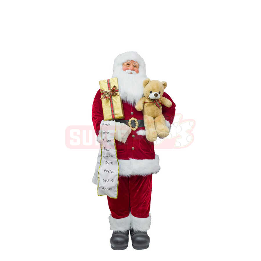 Bu böyük Şaxta Baba fiquru klassik qırmızı kostyumu, əlində hədiyyə paketi və oyuncaq ayı ilə Yeni il mövsiminə xüsusi bayram ruhu gətirir. Əlində yerləşən ad siyahısı və detallı dizaynı sayəsində həm ev dekorunda, həm də mağaza vitrini, tədbir və fotozona tərtibatında ideal seçimdir. Keyfiyyətli materialdan hazırlanmış bu fiqur bayram atmosferini daha real və sehrli edəcək.
