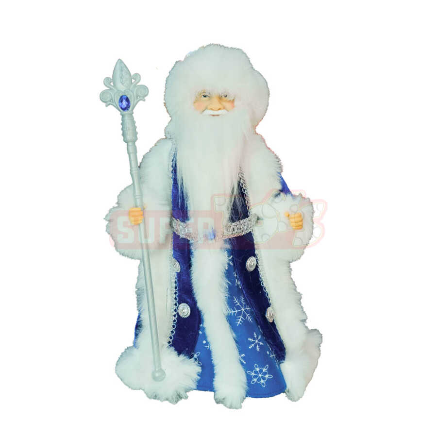 Səsli Şaxta Baba fiquru (40 sm) – klassik mavi və ağ rənglərin parlaq ahəngində hazırlanmış, bayram ovqatını canlandıran dekorativ fiqurdur. Parıltılı mavi geyimi, ağ xəz bəzəkləri və əlindəki əsası ilə bu fiqur həm göz oxşayır, həm də Yeni ilin sehrini evinizə gətirir.