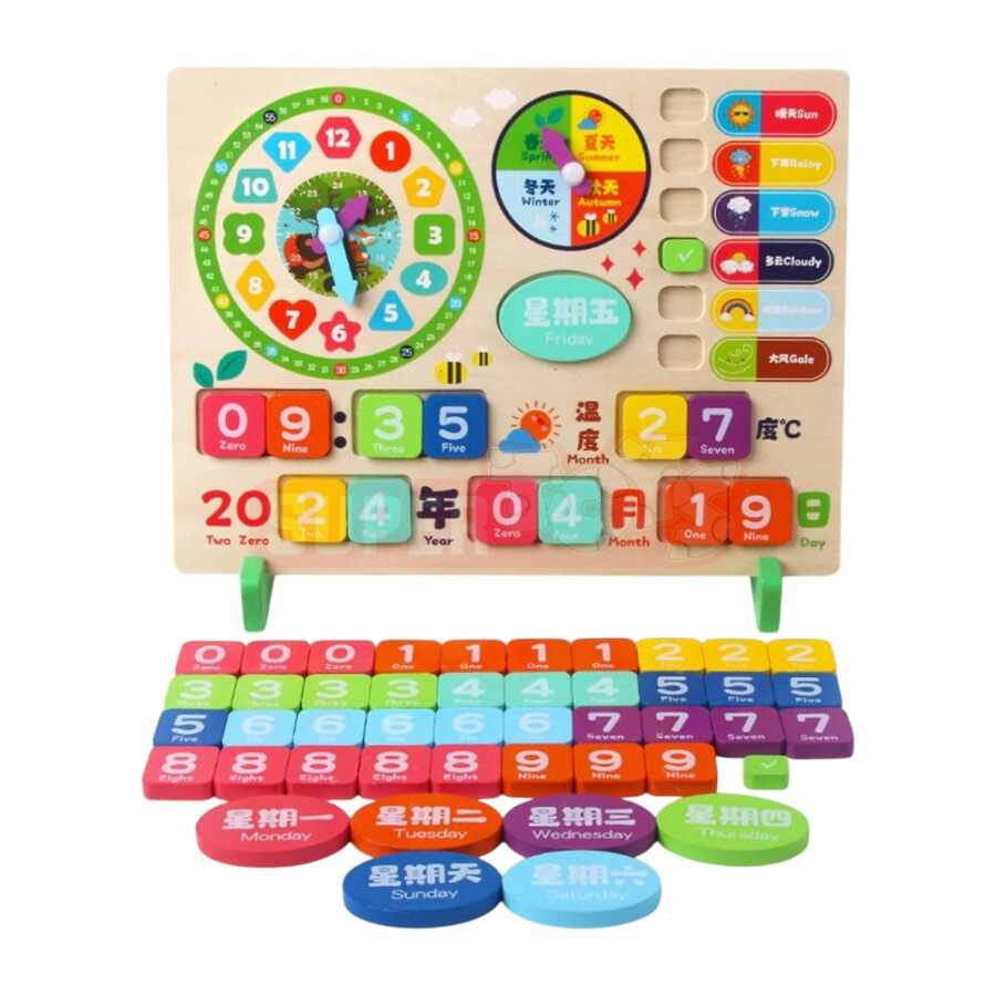 Taxta Çoxfunksiyalı Saat uşaqlara vaxt anlayışı ilə yanaşı tarix, ay, fəsil, həftənin günləri, hava vəziyyəti və temperatur mövzularını birlikdə öyrədən kompleks öyrədici taxta oyuncağıdır. Saat əqrəblərinin hərəkəti vasitəsilə vaxt oxuma bacarığı inkişaf edir, dəyişilə bilən bloklar isə uşağın tarix və təqvim anlayışını daha asan qavramasına kömək edir. Hava vəziyyəti və fəsil göstəriciləri uşaqlarda ətraf mühitlə bağlı ilkin biliklərin formalaşmasını təmin edir. Rəngli və vizual dizayn diqqəti artırır, gündəlik rutin və zaman planlamasını öyrədir. Bu məhsulu Supertoys mağazalarından və onlayn satışdan əldə edə bilərsiniz.