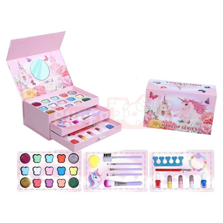 Unicorn mövzulu bu makiyaj dəsti makiyaj və kreativ oyunu sevən qızlar üçün ən sevimli seçimlərdən biridir. Dəst içərisində müxtəlif rəngli göz kölgələri, parıldadıcılar, dodaq məhsulları, fırçalar, süngər və aksesuarlar mövcuddur. Uşaq öz fantaziyasına uyğun makiyaj hazırlaya, rol oyunu vasitəsilə yaradıcılığını inkişaf etdirə bilər. Təhlükəsiz tərkibli və uşaqlar üçün uyğun hazırlanmış bu dəst həm evdə, həm də dostlarla oyun zamanı böyük maraq yaradır. Ad günü, Yeni il və digər xüsusi günlər üçün mükəmməl hədiyyə variantıdır. Bu məhsulu Supertoys mağazalarından və onlayn satışdan əldə edə bilərsiniz.