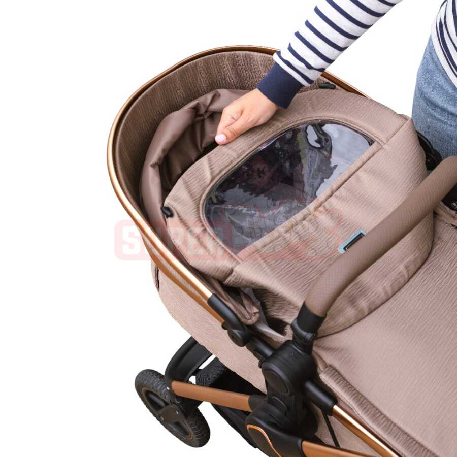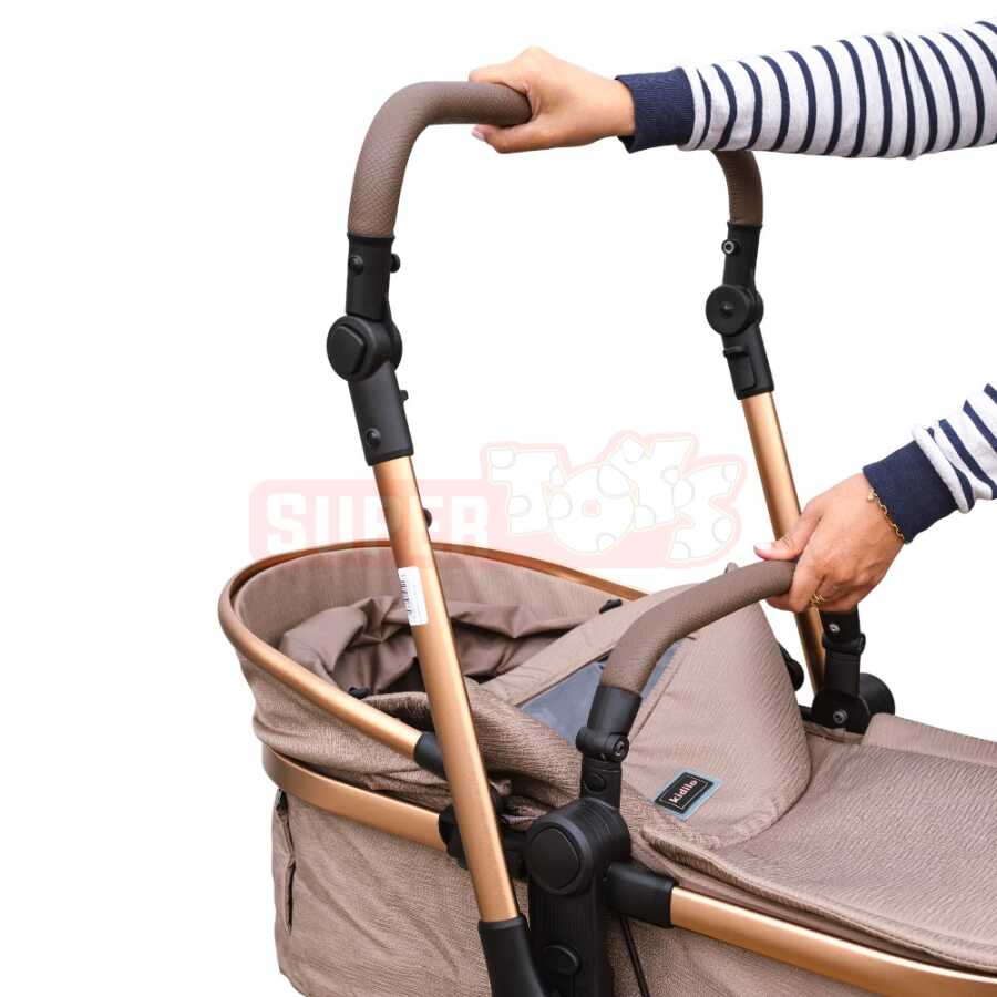 Şəkildə təqdim olunan lüks uşaq arabası (kalyaska) həm rahatlığı, həm də zərif dizaynı ilə seçilir. Qızılı çərçivə və açıq rəngli parça ilə hazırlanmış bu model həm beşik, həm də oturacaq funksiyasında istifadə edilə bilir. Yüksək keyfiyyətli təkərlər, güclü amortizasiya sistemi və geniş alt səbət valideynlər üçün maksimum rahatlıq təmin edir. Çantası ilə birlikdə təqdim olunan bu araba həm gündəlik istifadəyə, həm də səyahətə uyğundur.