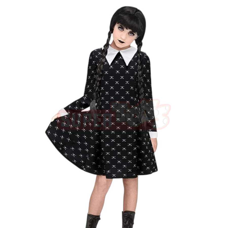 Wednesday Paltarı – Halloween geyimi ilə uşaqlar məşhur Addams Family qəhrəmanı Wednesday-in sirli və maraqlı obrazına çevrilə bilərlər. Qara rəngli uzun paltarı, ağ yaxalı və manjet detalları ilə orijinal dizayna sahibdir. Rahat parçadan hazırlanıb və həm Halloween gecələri, həm də məktəb tamaşaları, karnaval və tematik tədbirlər üçün mükəmməl seçimdir.