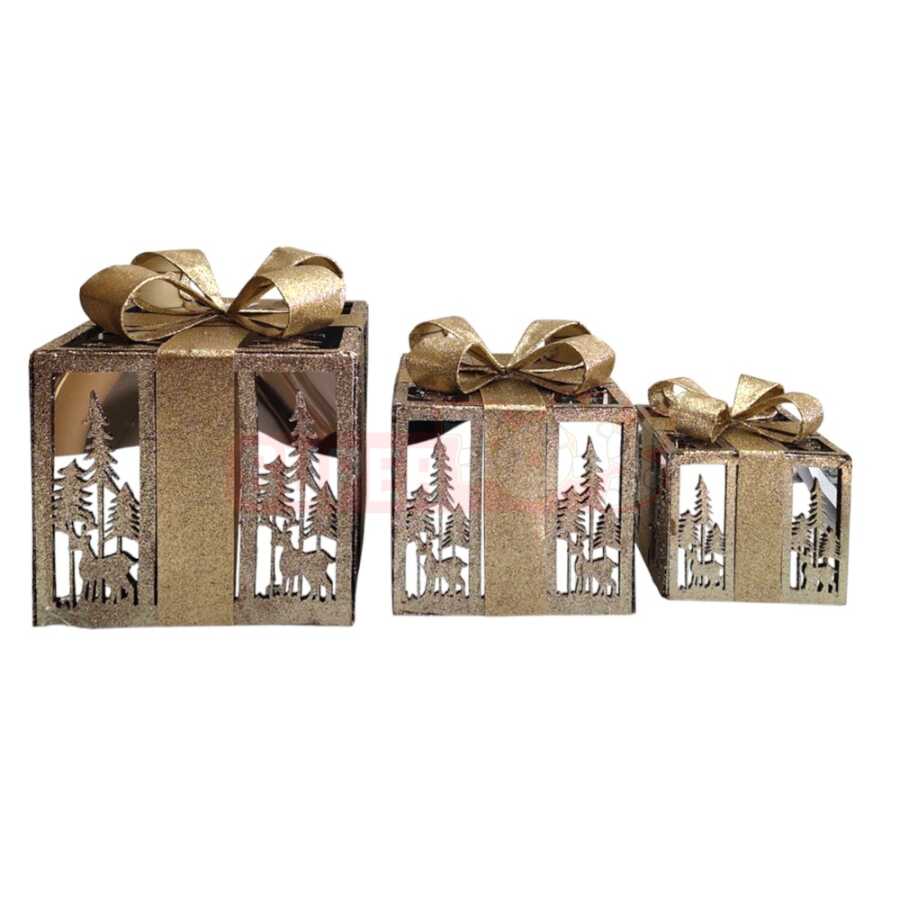 Zərif qızılı rəngdə hazırlanmış dekorativ 3-lü hədiyyə qutusu Yeni İl ab-havasını evinizə gətirir. Şam ağacı və maral naxışları ilə bəzədilmiş unikal dizaynı bayram dekorasiyasına xüsusi şarm qatır. Yolka altına yerləşdirmək və ya ev dekoru üçün mükəmməl seçimdir. Həm də hədiyyəlik olaraq təqdim edilə biləcək estetik və zərif aksesuardır.
