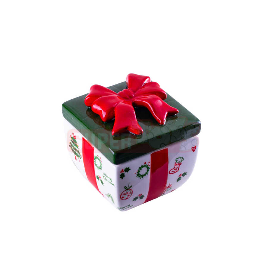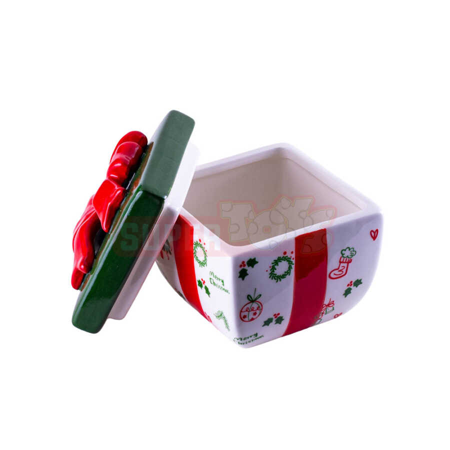 Merry Christmas temalı qapaqlı dekorativ keramika qutu bayram mövsümündə həm süfrə, həm də dekor üçün zərif bir tamamlayıcıdır. Hədiyyə formasında dizayn edilmiş bu modelin yaşıl qapağı və qırmızı lent motivi Yeni İl ruhunu əks etdirir. Şirniyyat, qoz-fındıq və ya kiçik aksesuarların saxlanması üçün mükəmməldir.