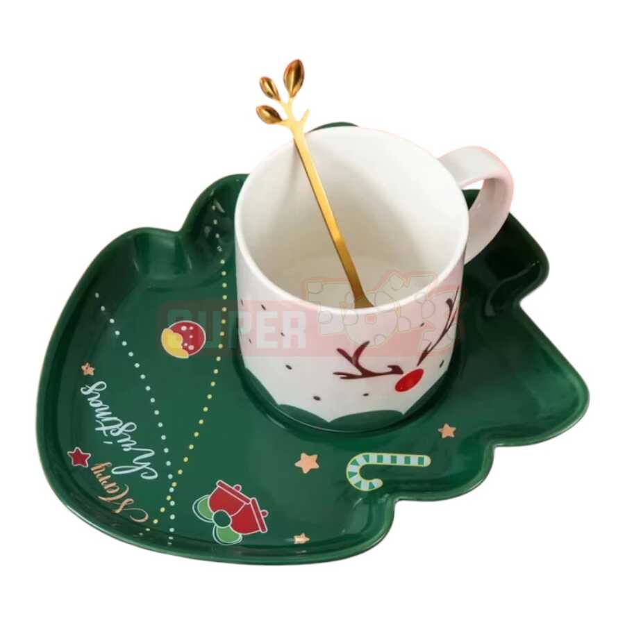 Dəstə daxildir: Fincan, şam ağacı formalı boşqab və qızılı qaşıq