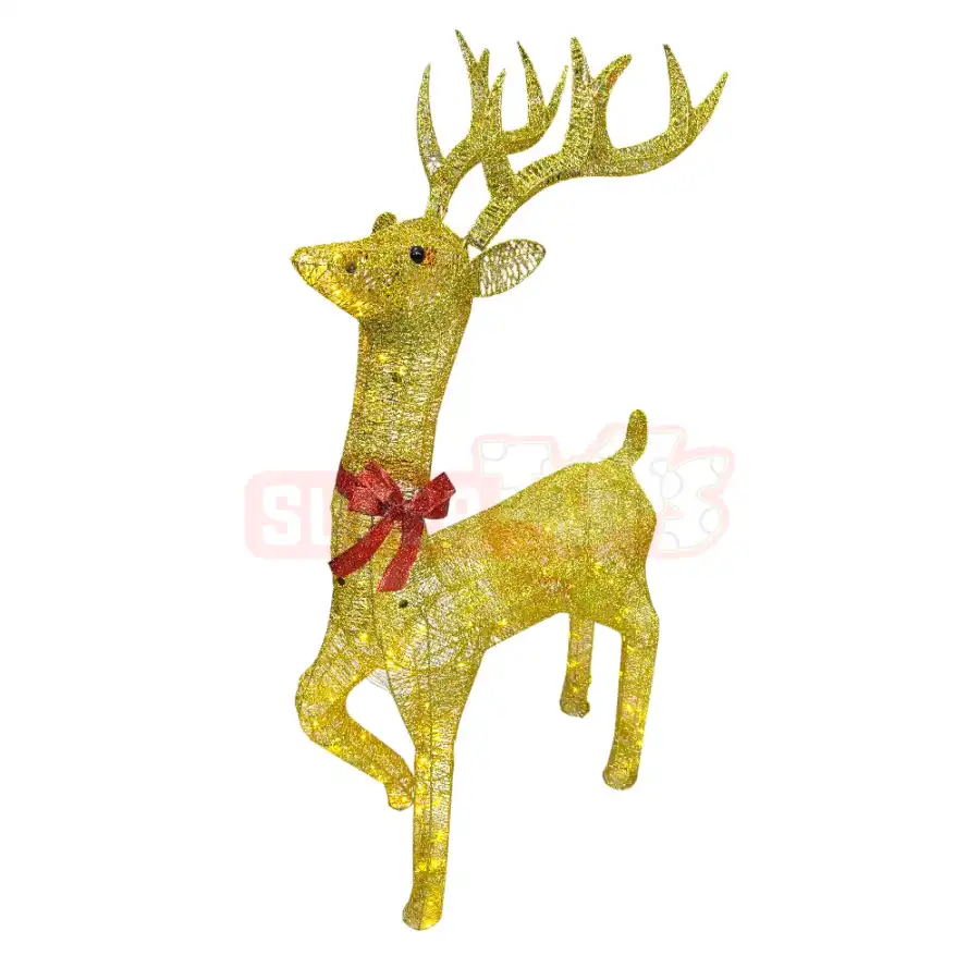 Qızılı LED işıqlı maral dekoru Yeni İl atmosferini daha da zərif və parlaq göstərmək üçün hazırlanmış premium fiqurdur. Metal karkas üzərində qızılı parıldayan tor materialı istifadə olunub və daxili LED işıqlar sayəsində həm gündüz, həm də qaranlıqda diqqətçəkən görünüş yaradır. Boyundakı qırmızı lent isə klassik bayram estetikasına xüsusi zəriflik qatır. Mağaza vitrinləri, restoran və otel fotozonaları, tədbir dekorları, yolka altı bəzəyi və ev interyerləri üçün ideal seçimdir. Yüngül konstruksiya sayəsində daşınması rahatdır və istifadəsi çox praktikdir.