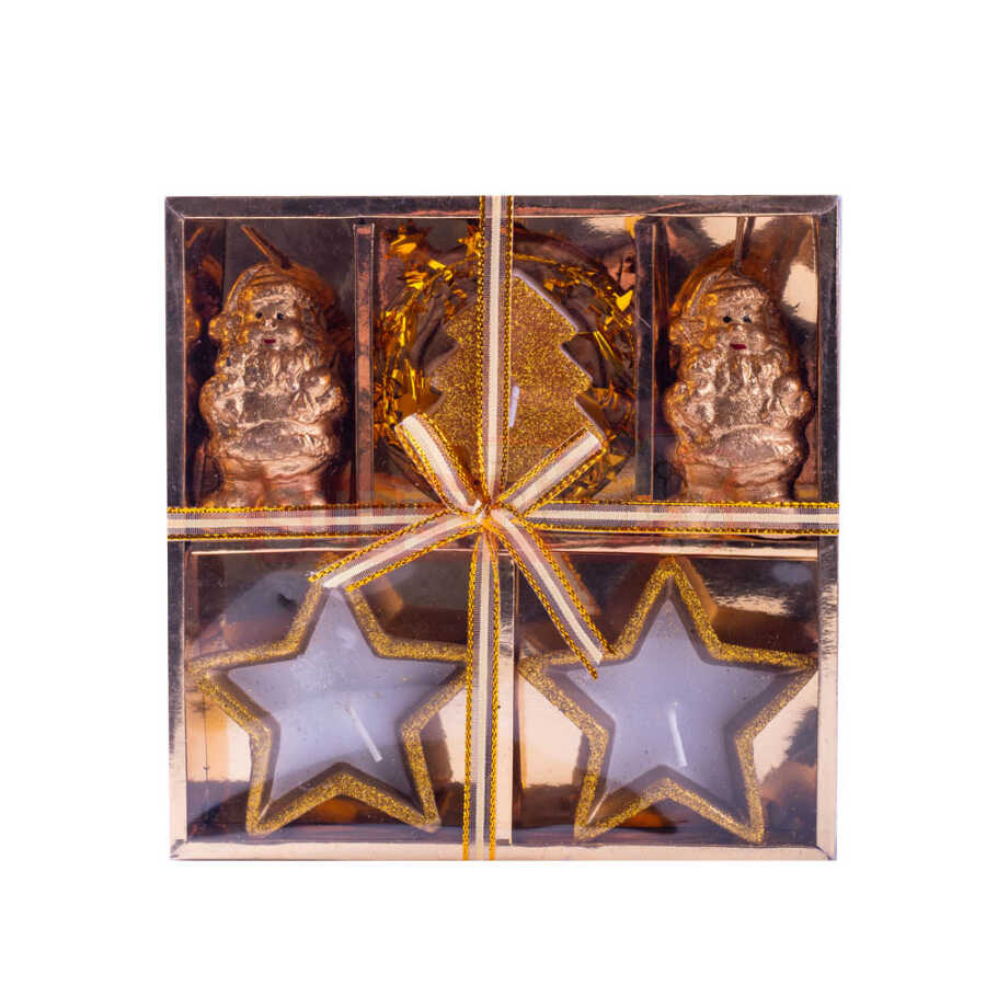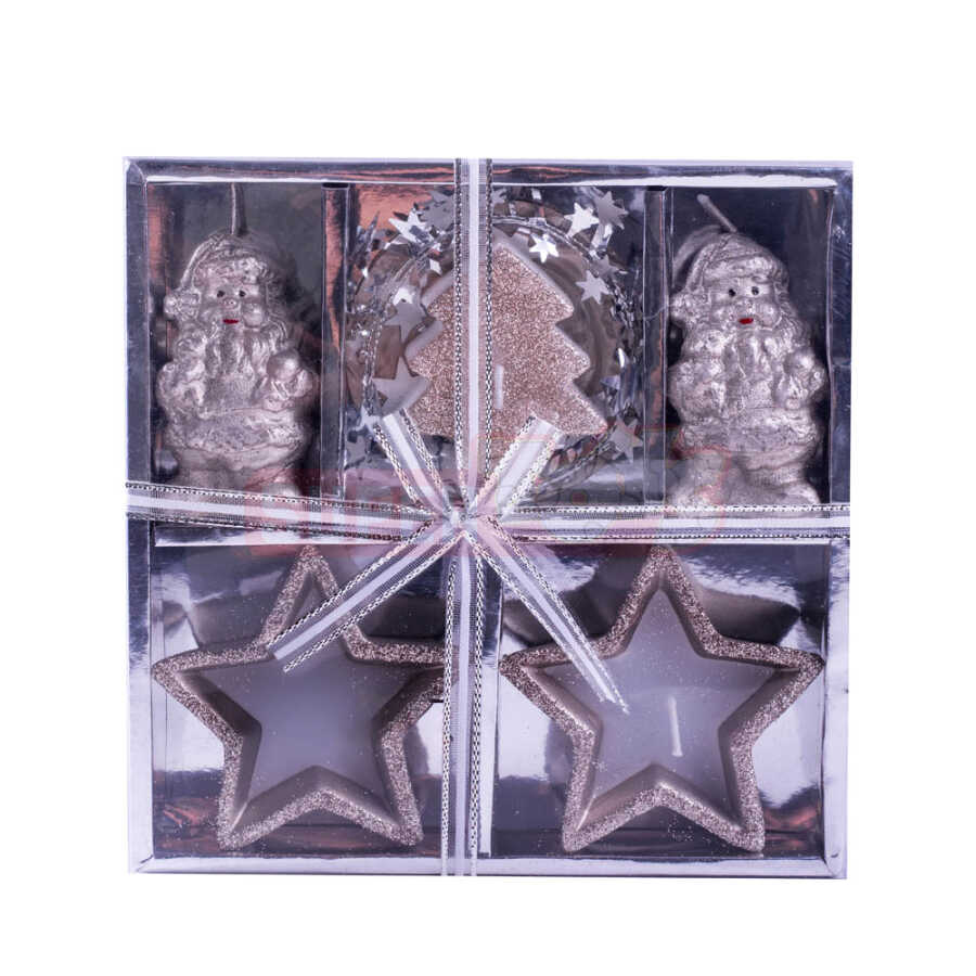 Yeni ilin parıltısını evinizə gətirən bu ulduz və Şaxta Baba formalı şam dəsti, həm dekorativ, həm də hədiyyəlik məqsədlə mükəmməl seçimdir. Qızılı və gümüşü rəng çalarlarında hazırlanan bu dəst, bayram süfrələri və vitrinlər üçün zərif işıq saçan aksessuardır. Parlaq lentlə bəzədilmiş hədiyyəlik qutuda təqdim olunduğu üçün sevdiklərinizə Yeni il hədiyyəsi kimi də çox uyğundur.