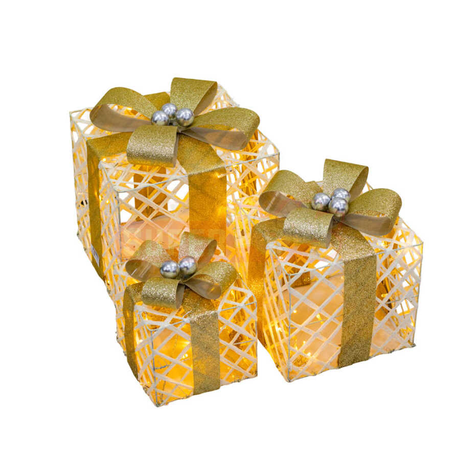 Qızılı lentlə bəzədilmiş bu LED işıqlı hədiyyə qutusu dəsti, Yeni İl dekorasiyası üçün ən zərif və parlaq seçimlərdən biridir. Üç fərqli ölçüdə olan qutuların içərisində yerləşən LED işıqlar, evinizə və ya ofisinizə isti və bayram əhval-ruhiyyəsi gətirir. Qutuların qızılı lent bəzəkləri, parıltılı səthi və işıq effektləri istənilən məkanı daha da cəlbedici göstərir. Yolka altı, süfrə, vitrin və ya giriş dekoru kimi istifadə oluna bilər. Həm fərdi, həm də hədiyyə məqsədli bəzək üçün idealdır.