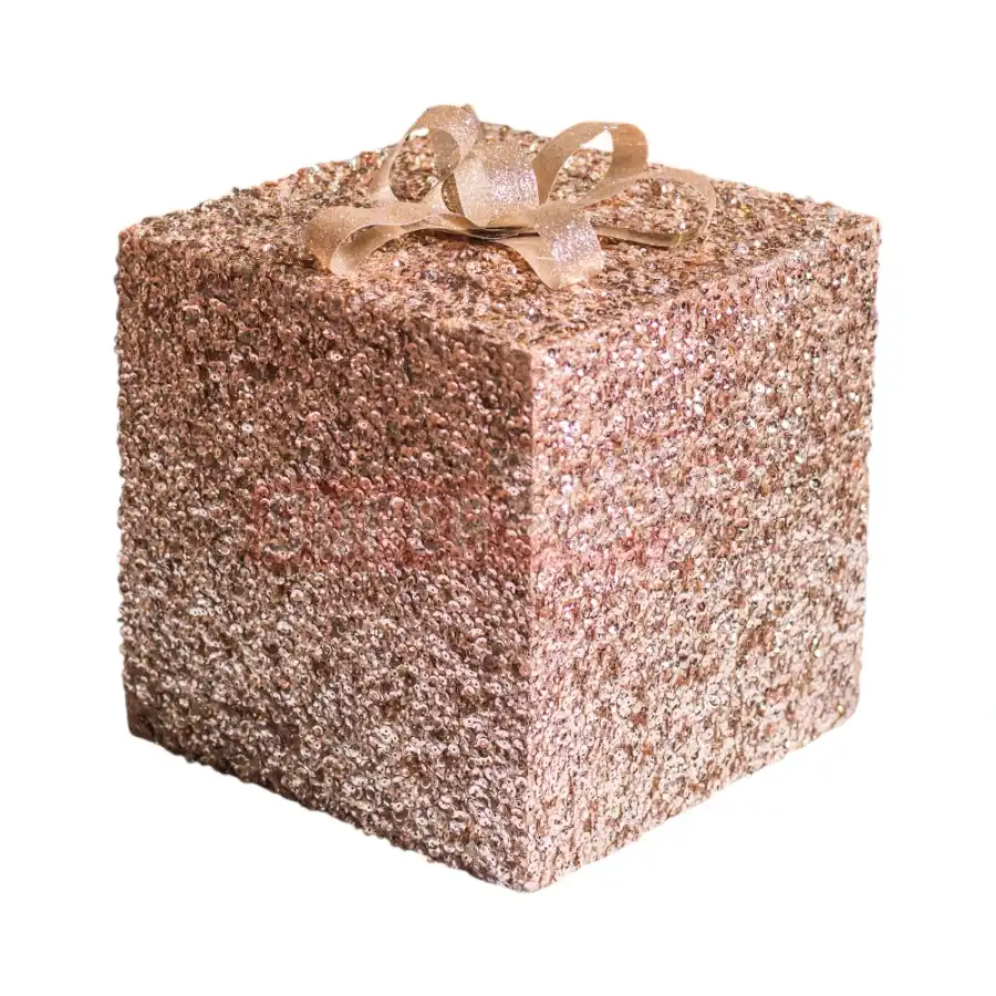 Parıltılı qızılı dekorativ hədiyyə qutusu məkanınıza lüks və bayram ab-havası qatmaq üçün əla seçimdir. Üzəri tam şəkildə parıldayan seqvinlərlə örtülmüşdür və üst hissəsindəki zərif lent bəzəyi məhsula daha da premium görünüş verir.