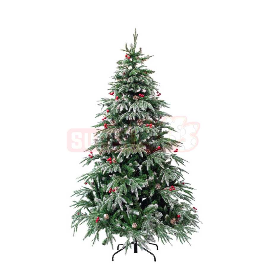 Qar effekti, təbii görünüşlü budaqlar, qırmızı giləmələr və şam qozaları ilə bəzədilmiş bu premium Yeni İl yolkası evinizə xüsusi bayram abu-havası gətirir. Realistik şam budaqları sayəsində yolka həm fotozonalar, həm vitrinlər, həm də ev dekoru üçün ideal seçimdir. Geniş və sıx budaq quruluşu bəzəklərin daha dolğun görünməsinə imkan yaradır. Quraşdırması olduqca rahatdır və metal dayağı sayəsində möhkəm dayanıqlığa malikdir. Yeni ilin klassik və zərif görüntüsünü sevənlər üçün ən ideal modeldir.