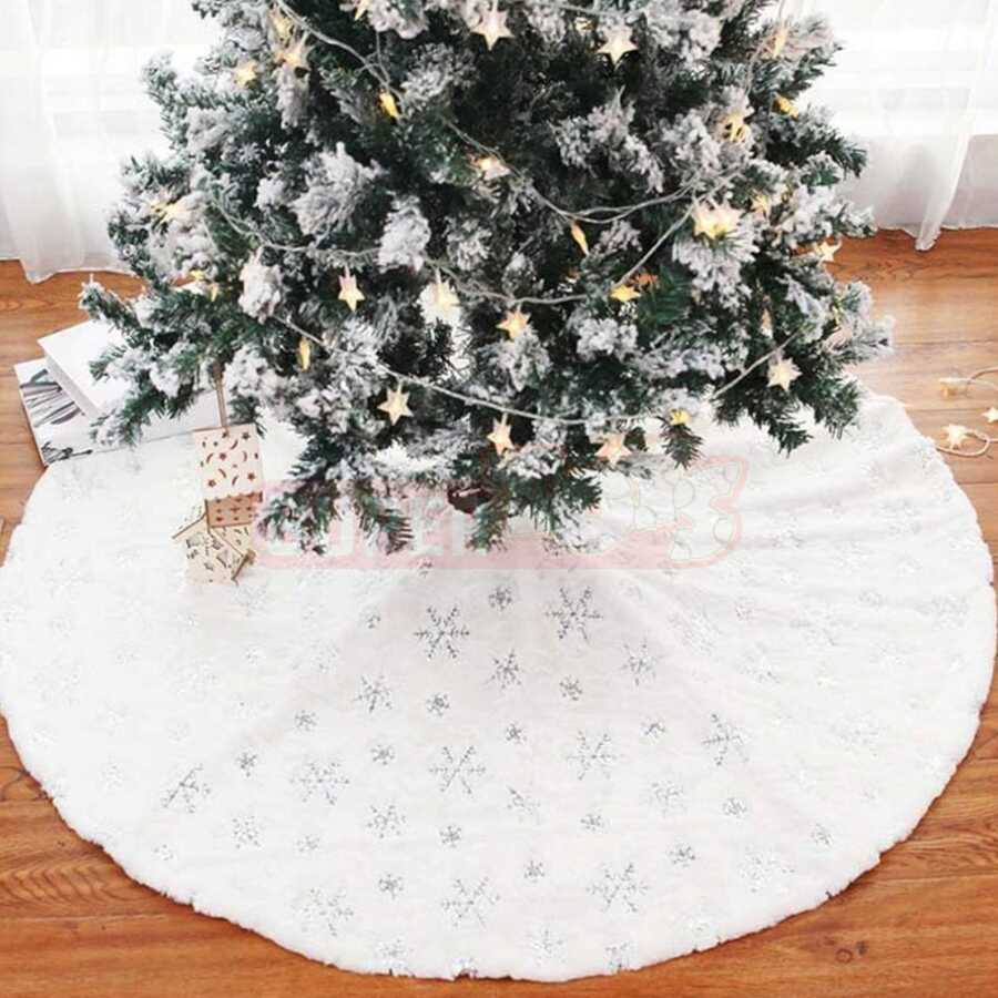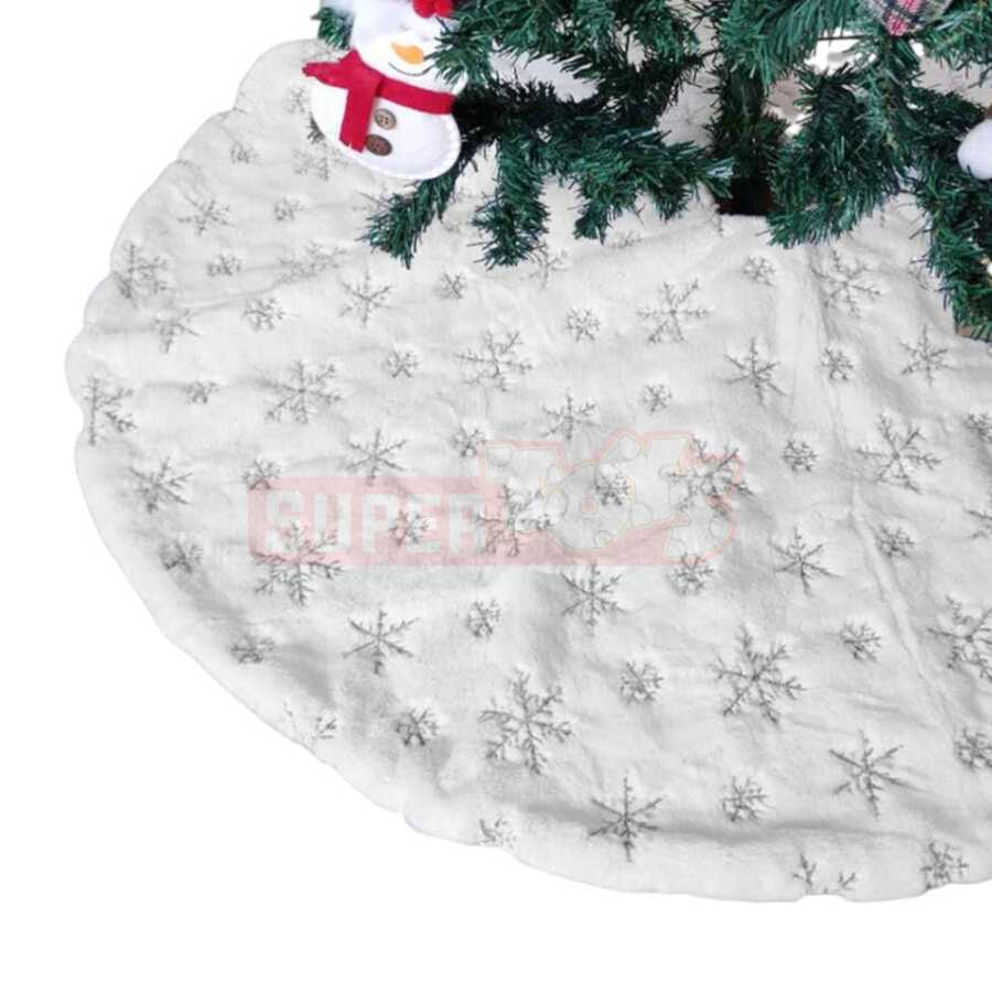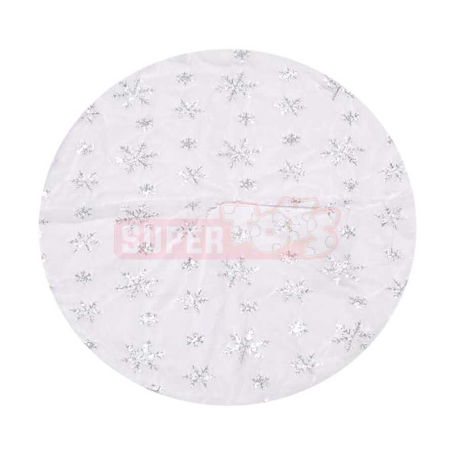 Zərif və şık dizaynı ilə ağ rəngli yolka altlığı (90 sm) Yeni il ağacınıza qış mövsümünün sehrini gətirir. Gümüşü qar dənəsi naxışları sayəsində parlaq və zərif görüntü yaradır. Ağacın alt hissəsini həm qoruyur, həm də dekorasiyanı tamamlayır.