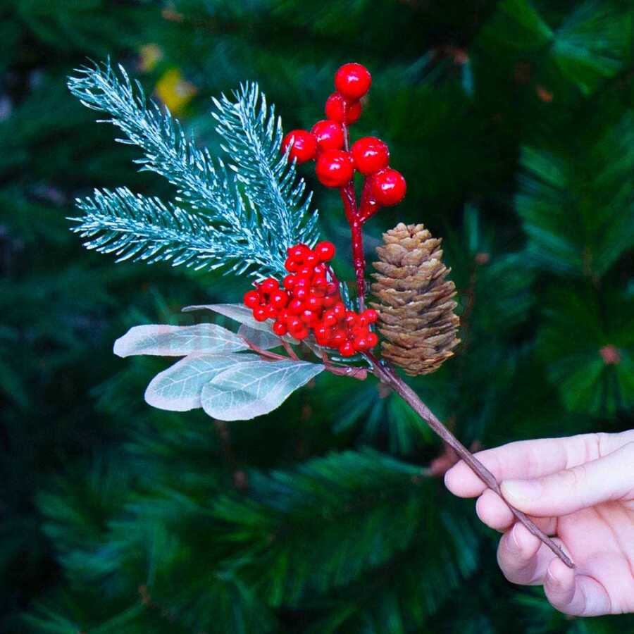Yeni il bəzəklərinizi daha təbii və gözoxşayan etmək üçün konus, qırmızı giləmeyvə və yaşıl budaqlardan ibarət yolka çiçəyi ideal seçimdir. Bu dekor yolkanızı daha təmtəraqlı göstərir və bayram ab-havasını evinizə gətirir.