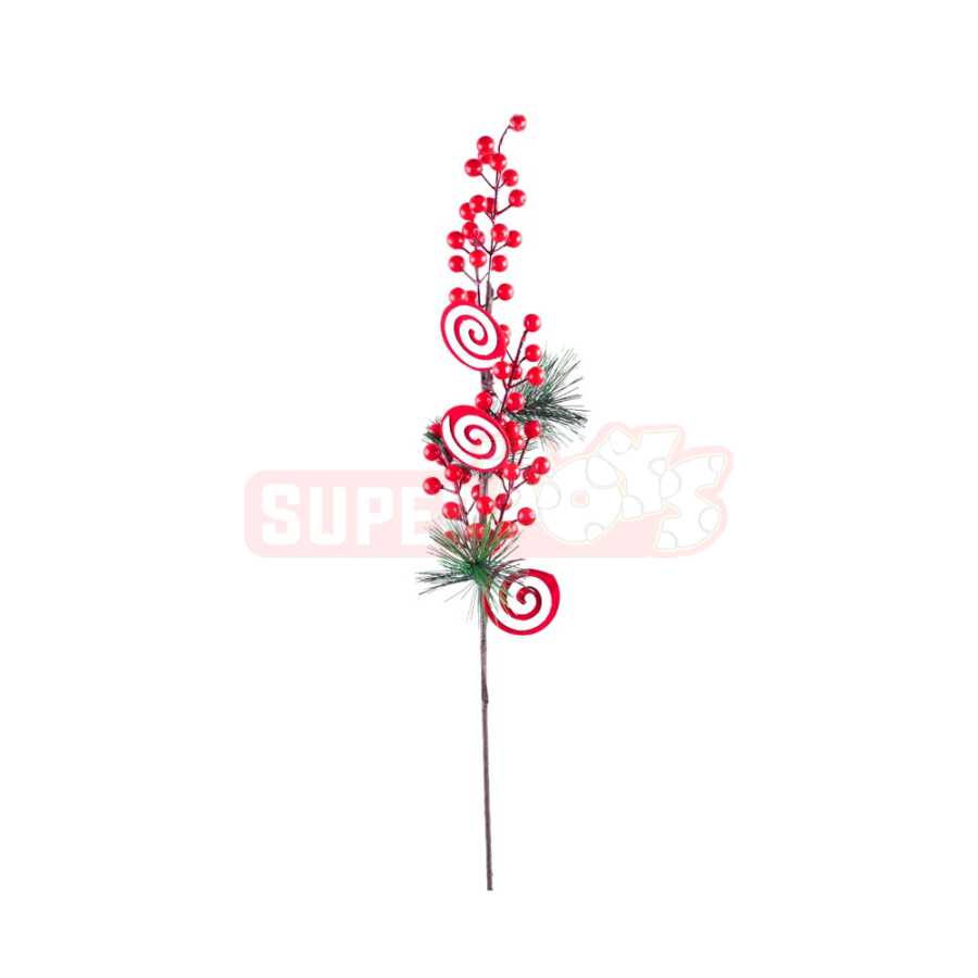 Qırmızı gilələr və ağ-qırmızı spiral formalı dekor elementləri ilə bəzədilmiş bu yolka çiçəyi, bayram enerjisini evinizə gətirir. Uzun saplı və elastik quruluşu sayəsində yolka ağacında, vazalarda və qapı çələnglərində istifadəyə uyğundur. Şam budaqları və parıltılı detalları sayəsində interyerə həm rəng, həm də canlılıq qatır.