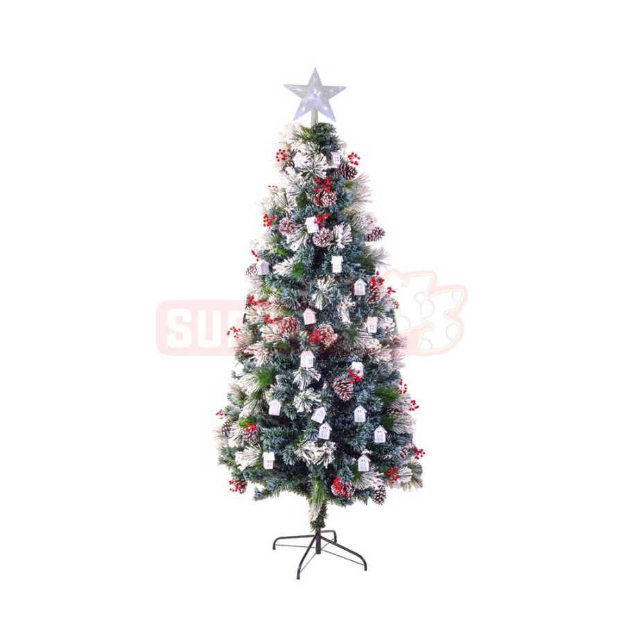 Ağ qar effekti, dekorativ ev fiqurları, çam qozaları və parlaq LED ulduz başlığı ilə bu Yeni il yolkası evinizə unikal və sehrli bayram abu-havası qatır. Sıx və real görünüşlü budaqlar sayəsində yolka həm təbii görünür, həm də bəzək elementləri ilə birlikdə daha zəngin vizual effekt yaradır.