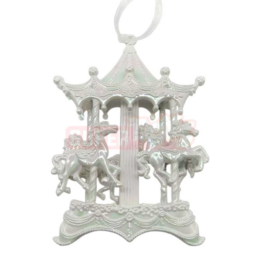 İncə və zərif detallarla işlənmiş 10×15 sm ölçülü karusel formalı yolka bəzəyi bayram ağacınıza nostaljik və sehrli bir hava qatacaq. Parıltılı inci rəngi və detallı at fiqurları ilə bu bəzək həm uşaqların, həm də böyüklərin diqqətini cəlb edir.