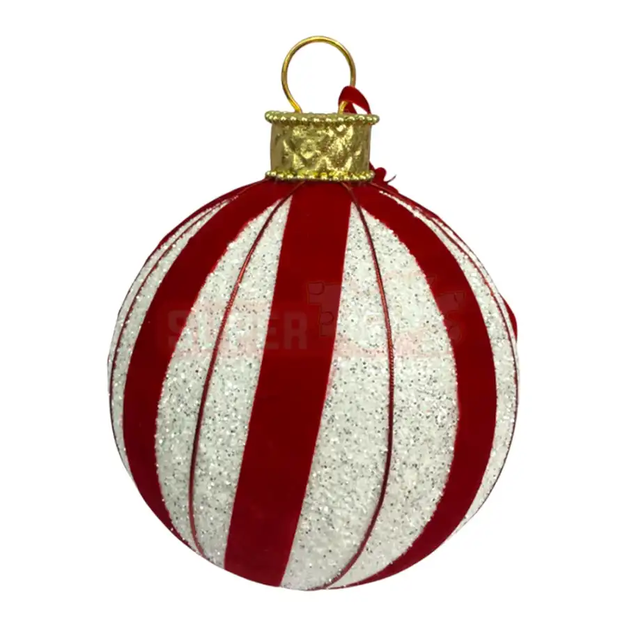 Ənənəvi qırmızı-ağ zolaqlı Yeni il bəzəyi, bayramın klassik rənglərini və ruhunu özündə birləşdirir. Zolaqlı dizaynı sayəsində həm müasir, həm də nostaljik dekorasiya tərzlərinə uyğun gəlir. Parıltılı ağ səth və zərif məxmər qırmızı zolaqlar işıq altında xüsusi parlaqlıq yaradır. Bu yolka bəzəyi ağacınıza harmoniya və bayram enerjisi qatacaq.