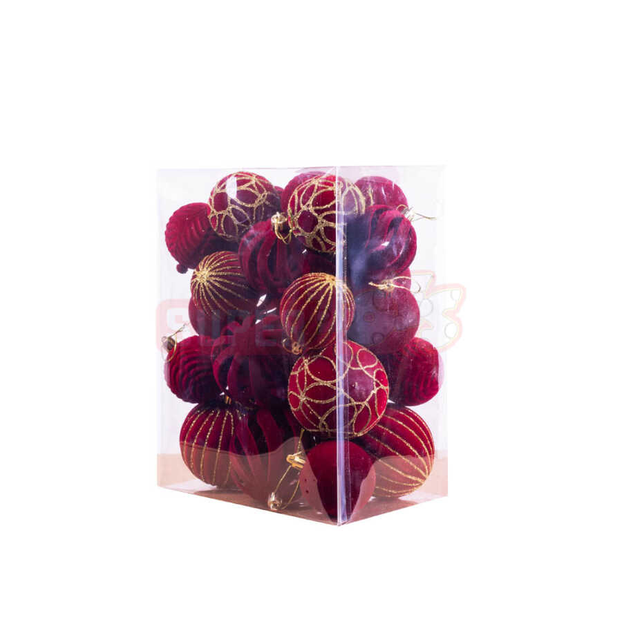 Qırmızı rəngli, müxtəlif dizayn və teksturalardan ibarət böyük yeni il şarı dəsti yolkanızı möhtəşəm göstərmək üçün ideal seçimdir. Qutunun içində həm velvet örtüklü, həm də parlaq qızılı naxışlarla bəzədilmiş premium şarlar mövcuddur. Fərqli naxışlar – xətti, spiral, toxuma effektli və glitterli dizaynlar dekorasiyanı daha zəngin edir və yolkada vizual harmoniyanı artırır.