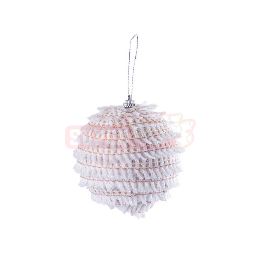 Zərif ağ və qızılı tonlarda hazırlanmış bu yolka bəzəyi, Yeni İl ağacınıza şıq və zərif görünüş qazandırır. Qat-qat teksturalı dizaynı və parıltılı səthi işıq altında xüsusi effekt yaradır. Qar effekti hissi verən bu bəzək həm ağ, həm də yaşıl yolkalarda mükəmməl görünür. Həm yolka, həm də ev və ofis dekorasiyası üçün ideal seçimdir.