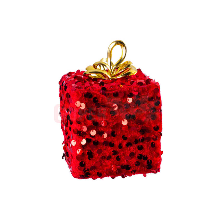 Qızılı lent və parıltılı səth ilə bəzədilmiş bu qırmızı hədiyyə fiquru, Yeni İl dekorasiyasına xüsusi parlaqlıq əlavə edir. Payetlərlə örtülmüş səthi işıq altında parlayaraq bayram abu-havasını gücləndirir. Kiçik ölçüsü sayəsində yolka, masa, vitrin və ya rəf üzərində dekorativ element kimi istifadə oluna bilər. Evinizi və ofisinizi qış bayramlarının ən sevimli simvolu ilə bəzəmək üçün ideal seçimdir.