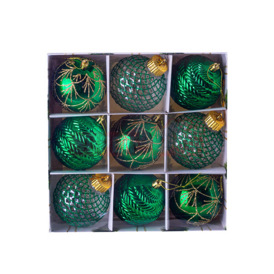 Bu yaşıl yolka bəzəyi seti ilə Yeni İl ağacınıza təbiətin və bayramın enerjisini gətirin. Qızılı naxışlarla bəzədilmiş 9 ədəd parıltılı topdan ibarət bu dəst, ağac işıqları altında xüsusi parıltı effekti yaradır. Müxtəlif dizaynlı və teksturalı toplar yolkanızı həm klassik, həm də zərif formada bəzəməyə imkan verir. Qutulu qablaşdırma sayəsində həm hədiyyə, həm də saxlama üçün ideal seçimdir.