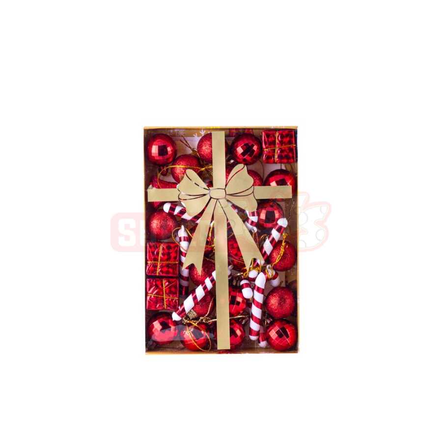 Tərkibi: Parlaq top bəzəklər, mini hədiyyə qutuları, konfet formalı bəzəklər